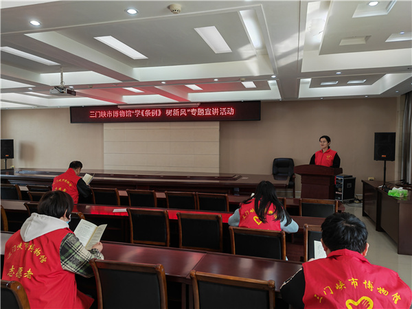 博物馆职工在会议室学习了习近平总书记给“中国好人”重要回信精神,营造了崇德向善的浓厚氛围,引导博物馆职工争做社会的好公民、单位的好员工、家庭的好成员。博物馆新时代宣讲师为大家介绍了《河南省文明行为促进条例》《三门峡市文明行为促进条例》内容,宣传文明行为规范,引导大家广泛践行。