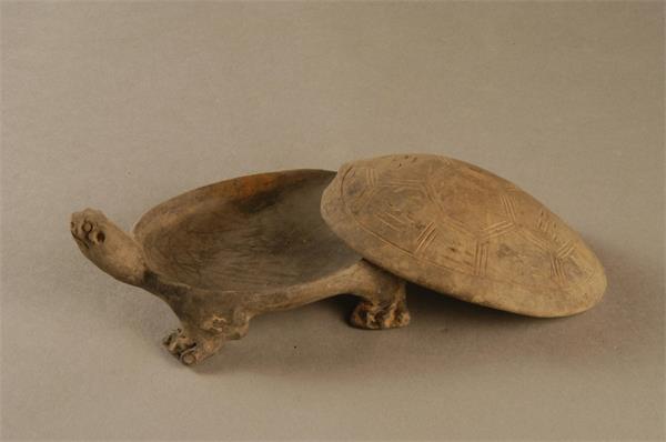 这方砚台1985年出土于三门峡市氧化铝厂工地。整方砚台呈乌龟形,首尾长9厘米,宽6.5厘米,高4.9厘米。砚盖上阴刻几何图案,中间为四个六边形,周围刻有八卦符号,仰头远视,四足着地,腹部前低后高,遗有墨迹,整方砚台神态生动。龟在古代是通灵和长寿的象征。除此之外,由于封建等级制度森严,在古代,龟具有崇高的地位,龟与龙、凤、麒麟并称四灵。《礼记·礼运》:“麟、凤、龟、龙,谓之四灵。故龙以为畜,故鱼鲔不淰;凤以为畜,故鸟不獝;麟以为畜,故兽不狘;龟以为畜,故人情不失。”《三辅黄图》卷三:“苍龙、白虎、朱雀、玄武,天之四灵,以正四方。”将四灵配四星,龟代表了玄武,北方之神,通冥之神,古代以龟甲兽骨占卜国运吉凶祸福。在古代,龙为百鳞之长,代表皇帝;凤为百禽之长,代表皇后;麟为百兽之长,为武将专用,龟为百介之长,成为最高文臣常用的器物。