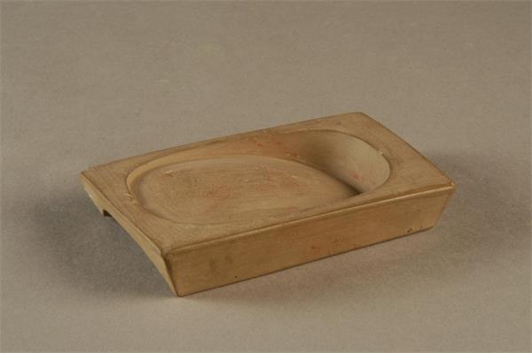 这方砚台1981年4月出土于灵宝市豫灵镇杜家村,色如熟粟,造型规整。整方砚呈长方形,长9.1厘米,宽6.1厘米,厚1.9厘米。砚面中部开椭圆形砚堂,砚堂较平,还有一部分与砚池相连成缓坡状,直至与砚池底部相连。砚底部挖空,两边为墙足,有活字模印的“三堂”款识。“三堂”疑为虢州治南唐代岐薛二王所建的庭院,曾受到许多文人题咏。如唐宋八大家之首的韩愈在《奉和虢州刘给事使君三堂新题二十一咏韵》序中云:“虢州刺史宅连水池竹林,往往为亭臺岛渚,目其处为三堂。”南宋刻书家兼藏书家廖莹中辑注道:“三堂建於开元中,吕温尝记之。谓三者,明臣子在三之节;堂者,励宗室肯堂之义。” 唐贾岛《题虢州三堂赠吴郎中》诗:“半岸泥沙孤鹤立,三堂风雨四门开。”宋苏轼《送王伯剔守虢》诗:“惟有使君千里来,欲饮三堂无事酒。”三堂”代表了澄泥砚匠人标明产地的商标意识。此砚造型大方简洁,线条流畅,具有典雅秀美、轻盈洒脱的风格。