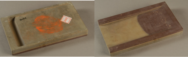 这方砚台1987年出土于陕县大营乡的一处工地上。通长22.3厘米,宽12.3厘米,厚2.2厘米。整方砚台为双面石砚,石质自然为两色,砚面为瓦灰色,砚背主要为紫色,犹如双面镜一样。