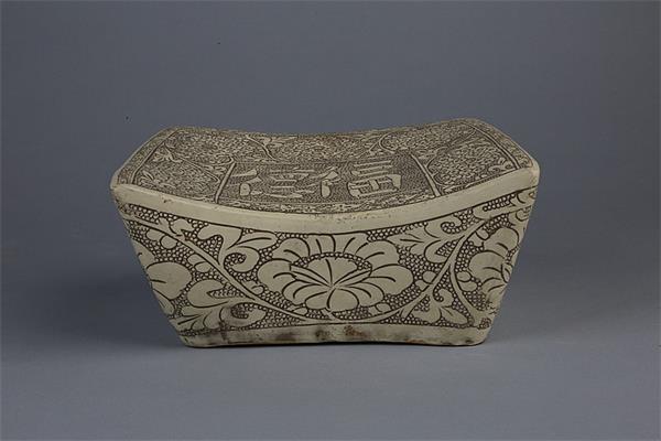 宋珍珠地“福德”枕 通高10cm,面22.8 cm× 15 cm,底15 cm×12 cm。枕面中部有“福德”二字,周围饰菊花纹,枕四周饰一圈牡丹花纹。