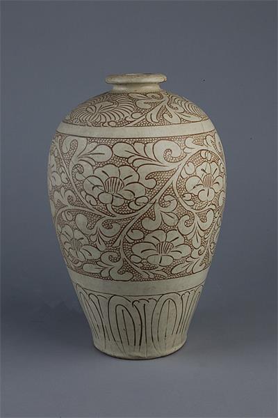 宋白釉珍珠地划花瓶 通高29.6cm,口径6.2cm,底径9.8cm,腹颈19cm。该器物通身饰珍珠地缠枝花纹,颈、肩为缠枝菊花纹,腹部饰牡丹花纹,下腹部至底部饰莲瓣纹,线条均匀流畅。