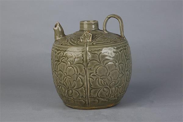 宋青釉刻花执壶 通高15.8cm,口径3.3cm,底径10cm,腹14.8cm。该器物通体施釉,釉色莹润、光泽明亮,剔花制作精细,线条明快。