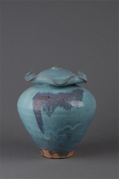 元钧釉荷叶盖罐 通高25cm,口径10.6cm,底径8.8cm,腹22.6cm。该器物造型端庄大方,釉质温润凝厚,腹部有窑变形成的紫红斑。