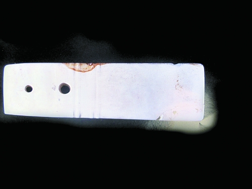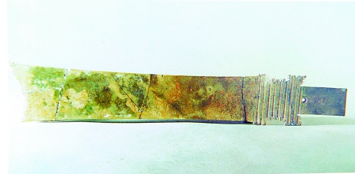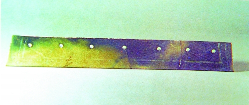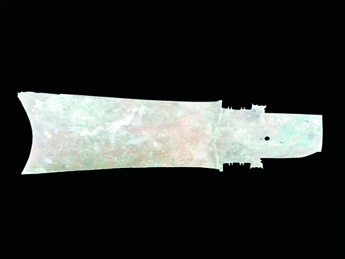 ②七孔玉刀(夏代,长65、宽9.5厘米,河南省偃师二里头遗址出土)