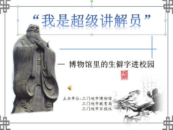 为深入贯彻习近平总书记在全国宣传思想工作会议“育新人、兴文化”的要求,由三门峡市博物馆、三门峡市教育局、三门峡日报社联合举办了“我是超级讲解员——博物馆里的生僻字进校园”志愿服务活动。本次活动从3月11日起至3月25日,共覆盖市直及湖滨区、开发区、陕州区各中小学校共计20所,服务师生3.5万余人。