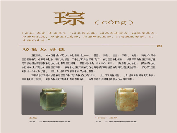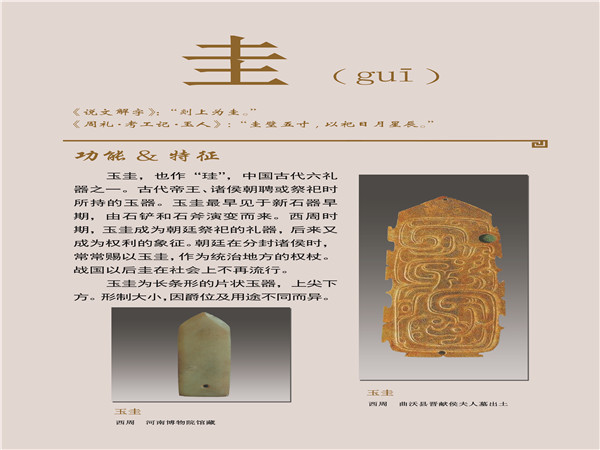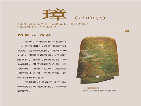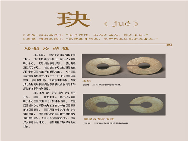 美石名玉,历来被视为风雅之物,在人们心目中占据着崇高的地位。它不仅凝聚了中华民族智慧与创造力的精华,更承载着中华民族的优秀文化,是中华文明发展演变的重要见证。此次展览,我们主要选取三门峡地区出土的精美玉器图样,从玉器名称中选择了常见器物的10个专用汉字,如玦(jué)、觿(xī)、韘(shè)等,采用注音、图示和释文相结合的形式展出。