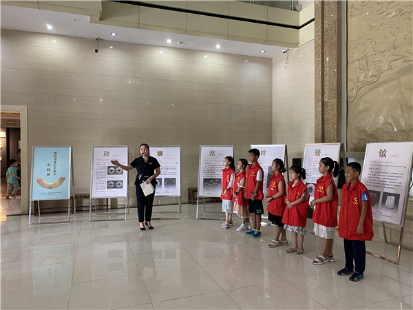 活动主要分为多媒体宣讲和现场讲解两个部分,首先讲解员在学术报告厅内利用精心制作的课件,通过幻灯片向小学生们展示“韘”“璋”“瑗”等十个生僻字,并结合器物照片、历史背景和玉器文化知识,让他们进一步了解到文字及文物的魅力;随后讲解员向小学生们传授讲解礼仪,并借助展板资料讲解生僻字,加深了他们对器物及字形的认识和理解。