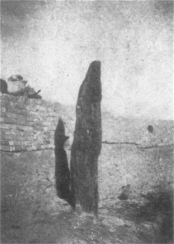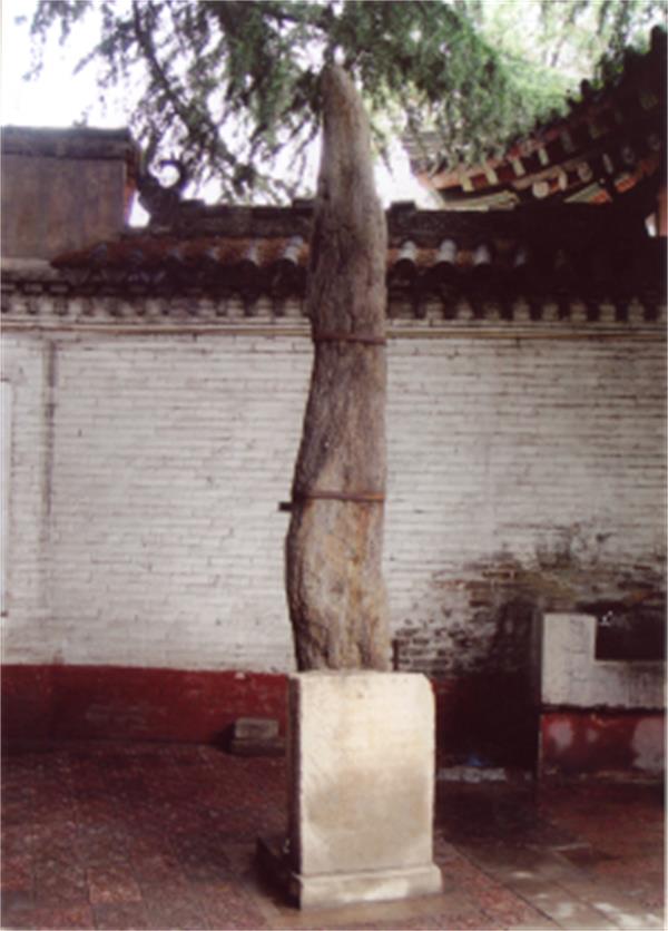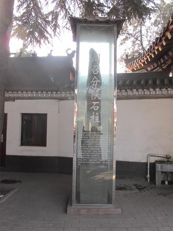 周召分陕石是西周初年周召二公分陕而治时所设的界碑,系用青石凿成的一根高3.5米的圆形石柱,原立于陕塬(今陕县张汴塬),后移至陕州北城墙上,当时还在原石柱处立有石碑一通,以示纪念。(图一)石碑正面自上而下有阴刻楷书“周召分陕处”五个大字,这是目前已知的最早确定并记载分陕石柱史实的。民国二十一年三月(1932年3月),陕州民众教育馆馆长曲完善负责收集文物时,将周召分陕石柱从陕州北城墙上移至陕州民众教育馆(原召公祠)收藏,并在石柱前立碑碣一通,名曰石柱志略。遗憾的是该石碑在十年动乱时,被东关农场民工队烧石灰当石料用了。新中国成立后,周召分陕石柱作为文物被政府重点保护。上世纪50年代建设三门峡大坝时,陕州古城属淹没区,石柱随其它古迹一同移至人民公园保存。1967年文革开始后,石柱被移至市图书馆,1977年又移至文化宫,1981年被三门峡市车马坑陈列馆收藏保护至今。起初石柱立于陈列馆院内正中,由于影响整体美观,1989年又将石柱移至车马塑像展厅门前的水池旁。立柱时,为防止石柱断裂,特在石柱后边加一垂直钢管以夹固支撑。(图二、三)