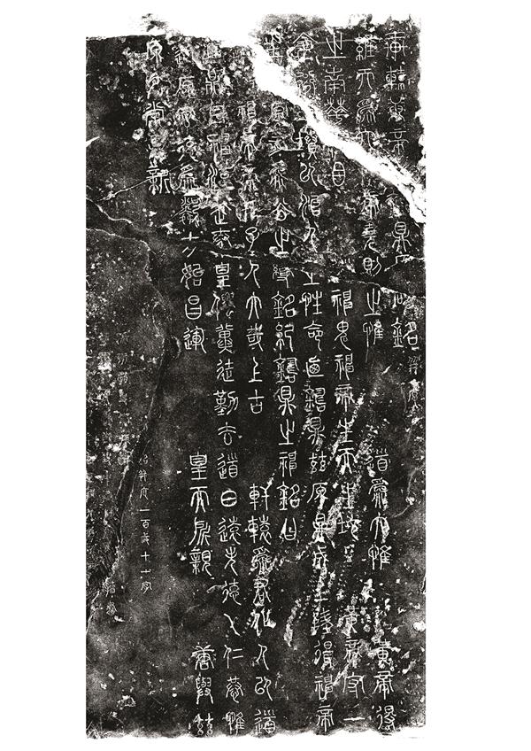 由于原碑额及碑体右上角表层被剥离,从碑的侧面可以明显看出来,剥离层厚约2厘米。(图三)这两处文字处在一个平面上,应是将剥离层重新打磨后又补刻上。碑额有八字,为“轩辕黄帝铸鼎碑铭”。碑体右上角共十四个字,自右向左为“轩辕黄帝/惟天为大/之南华/气衍/之”。其中有三个字出现刊石错误,即“惟”误为“维”、“气”误刻之字无法识别、“之”误为“生”,待后文勘误。可以看出这两处文字书体一致,笔画显得十分纤细,又有工巧之韵,给人们视觉带来一定的装饰感,但又显出几分呆板气息,且“轩、帝、鼎、铭”四字与原碑文迥异,这种书体风格与明代前期书法习惯十分相似。明代篆书以小篆为主流,朝廷在铨选官员时还特意把篆书作为必备条件之一。因此,从坊间布衣到出仕官员习篆书之风十分盛行。明中期以前的篆书,大多是在唐李阳冰“铁线篆”的基础上,规范整饬、笔画纤细、典雅工巧,具有较强的装饰性,但略嫌板滞,艺术水平不高,但与袁滋研习古籀的篆书风格相去甚远。