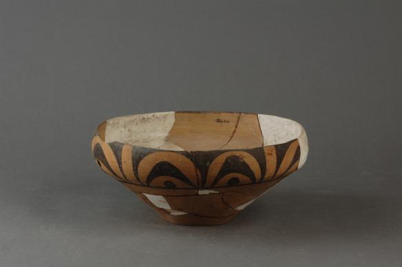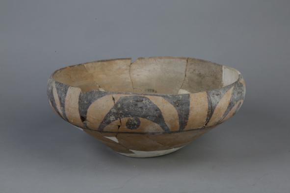 四、西阴纹彩陶钵(图四)。泥质黄陶,上腹绘黑彩垂弧纹与西阴纹,通高8.0cm,口径15.3cm,底径5.5cm。垂弧纹和西阴纹的组合搭配在庙底沟出土的彩陶中很常见,一般垂弧纹都作为点缀,中间空出的弯角状纹饰(西阴纹)作为主体纹饰,属典型的地纹彩陶。该种纹饰彩陶因其较早发现于山西夏县西阴村遗址,被李济先生称之为“西阴纹”,这是庙底沟文化彩陶中唯一一种以地名命名的彩陶纹饰。在《史前中国的艺术浪潮——庙底沟文化彩陶研究》一书中,王仁湘先生对“西阴纹”的描述为“周围以黑彩衬地,中间形成一个左边一个宽头,右边弧收成翘起的尖角,中间有时点缀斜线与圆点”,并通过对不同地区出土的庙底沟时期“西阴纹”彩陶进行了比对和分类,将其分为6种形式,这对此类纹饰的研究提供了更加详实和系统的资料。当然,对于这种纹饰的研究,李济、梁思永、严文明等考古界前辈也都有涉足,足见其独特魅力。